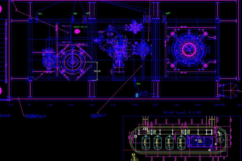Wir erstellen genaue Aufstellungspläne. Die Pläne umfassen die Aufstellung von Anlagenteilen wie Pumpen, Behälter, Wärmetauscher und andere Apparate, die Bestandteil des Projektes sind.