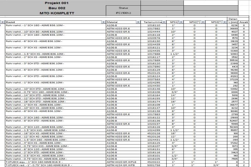 Die genaue Materialmengenauflistung ist ein sehr wichtiger Teil des Projektes. In jeder Planungsphase können aktuelle "Material Take Offs" erstellt werden, egal ob es sich um Rohre, Fittings oder Armaturen handelt.